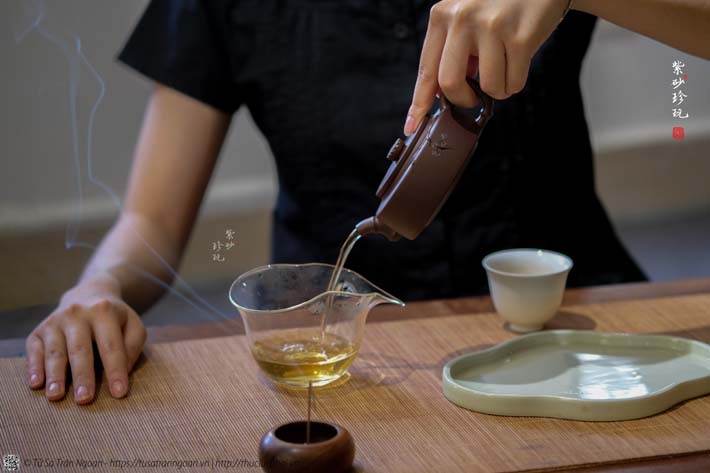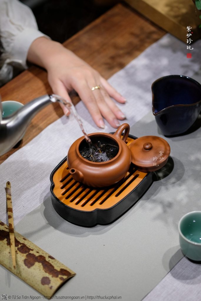- Trước khi pha: Dội nước sôi nhanh để rửa trà (tráng trà). Bước này vừa làm nóng dụng cụ, vừa giúp lá trà nở đều, chuẩn bị cho những chén trà ngon nhất.