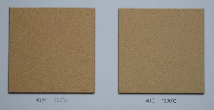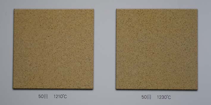 - Sau nung: Khoáng thể hiện gam nâu vàng pha sắc đỏ nhạt. Thể chất có cảm giác hạt khoáng rõ rệt, kết cấu thô nhưng không xốp. Trên bề mặt, những hạt cát hơi nổi ẩn hiện với các màu vàng nhạt, mặc nhạt và tử hồng, tạo nên hiệu ứng màu sắc hết sức phong phú.
