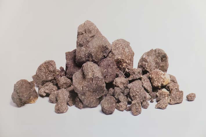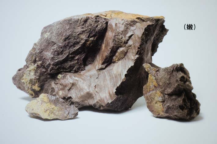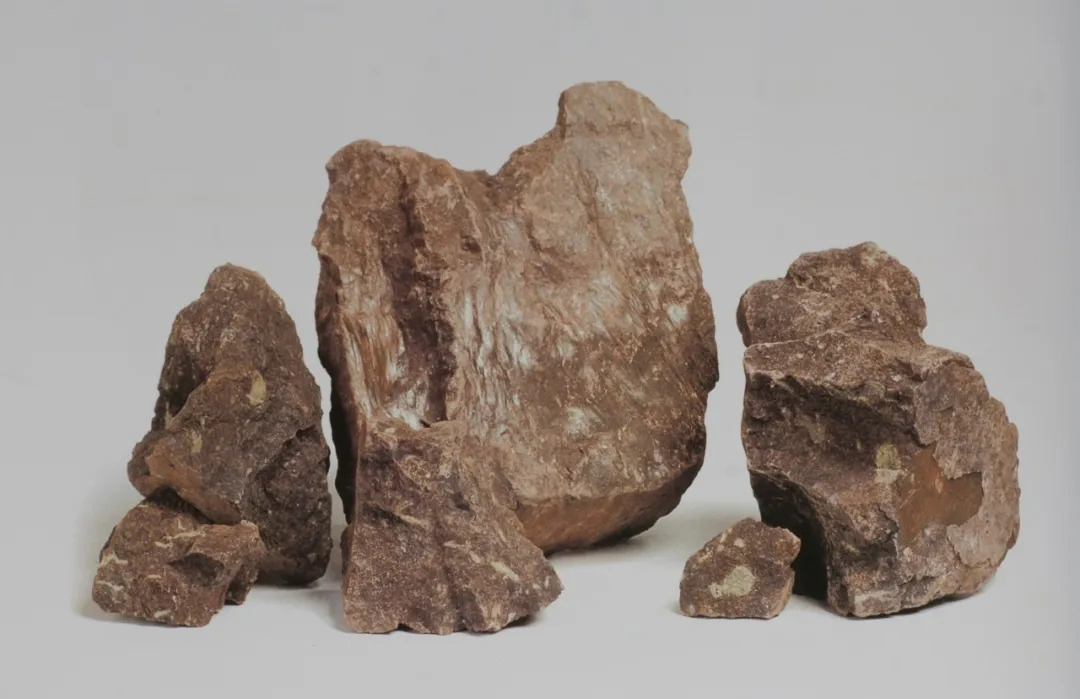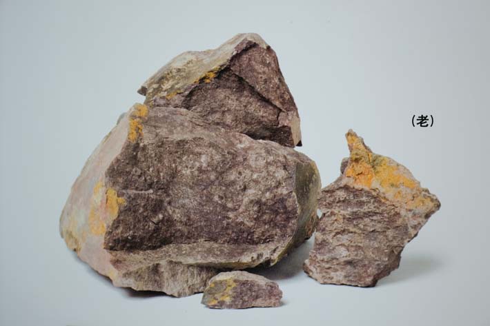 Khoáng liệu có dạng khối đặc màu tím nâu, kết cấu rắn chắc như đá, chứa một lượng nhất định mảnh mica trắng.