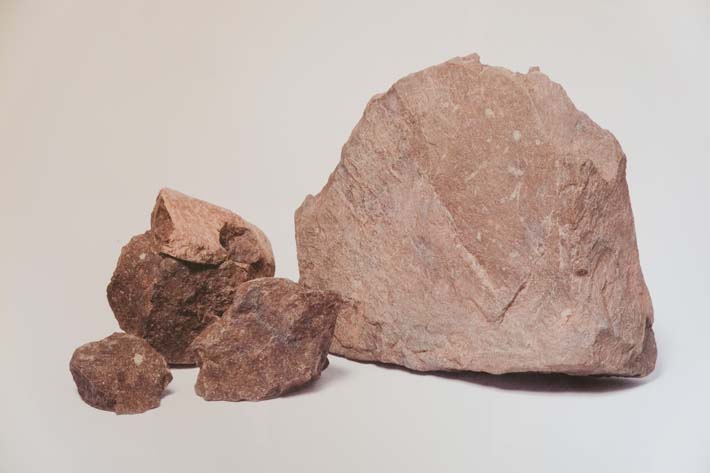 Khoáng liệu có dạng khối đặc màu đỏ nâu, kết cấu khá rắn chắc, chứa một lượng nhỏ mảnh mica trắng. Trên bề mặt khoáng xuất hiện các đốm nhỏ và vân loang màu vàng xanh nhạt, xen lẫn các vệt màu tím đen.