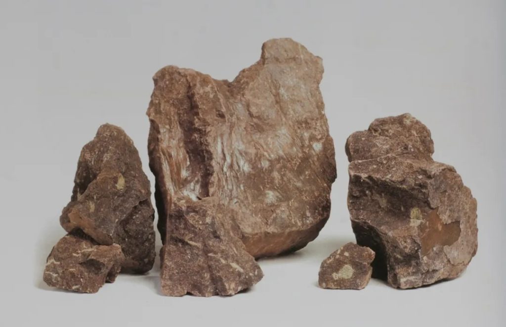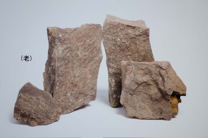 Được khai thác từ mỏ lộ thiên tại Đài Tây. Khoáng liệu có dạng khối đặc màu tím đỏ pha nâu, kết cấu khá rắn chắc, chứa một lượng nhất định các mảnh mica trắng. Trên bề mặt khoáng xuất hiện các đốm hoặc vân loang màu xanh nhạt, xen lẫn hoa văn tím đen.