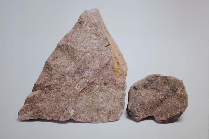 Khoáng liệu có dạng khối đặc màu tím nâu, tương đối cứng chắc, chứa khá nhiều mảnh vụn mica trắng. Trên bề mặt khoáng có các đốm và vệt màu đỏ sẫm cùng màu xanh xám nhạt, kèm theo vệt gỉ sắt hoặc mảng gỉ sắt.